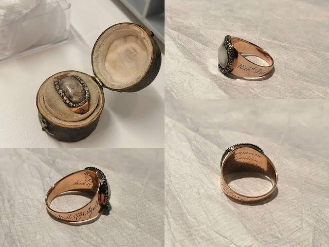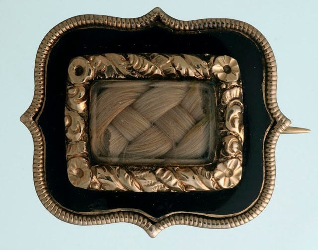 Families were able to send the hair to businesses that specialised in mourning jewellery. The hair would be woven into a pattern and incorporated into a ring or another piece of jewellery. Engraved on the back of the jewellery would be the name, age, and date of death of the loved one.