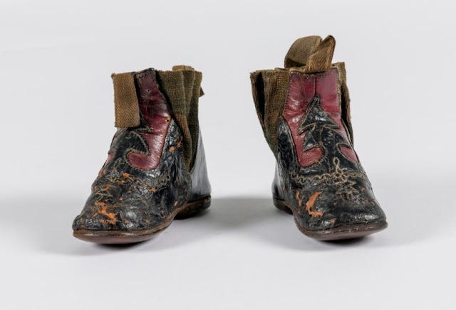 These leather boots were purchased by William and Mary Davies of Tonypandy for their infant son. Sadly, these boots were never worn as the baby died aged seven months on 6th January 1879.