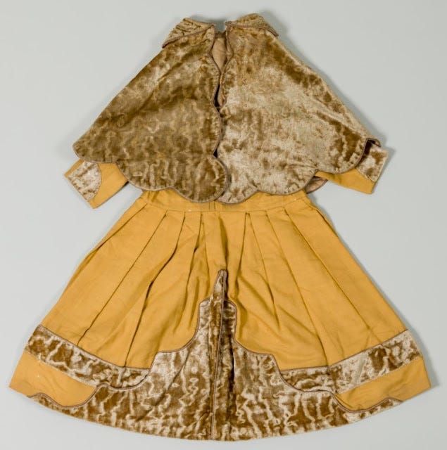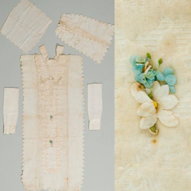 This baby's velvet cape and matching robe were bought in 1889 for a baby boy from Ebbw Vale. Sadly. the outfit remained unworn as the infant died aged seven months.