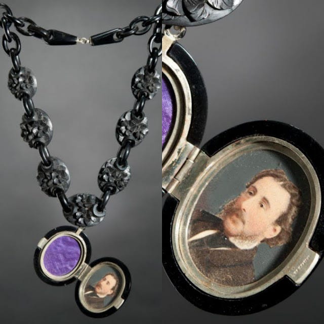 This jet mourning necklace dates from c.1880 and contains a miniature portrait of the owner's father.