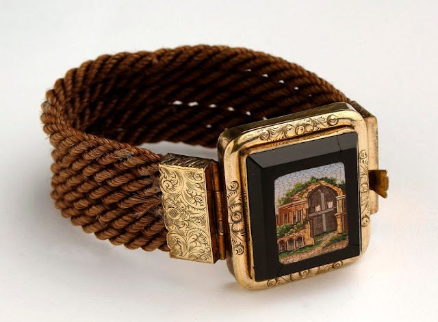 This mourning bracelet is made from woven hair which is held by gold clasps and a mosaic-style image.