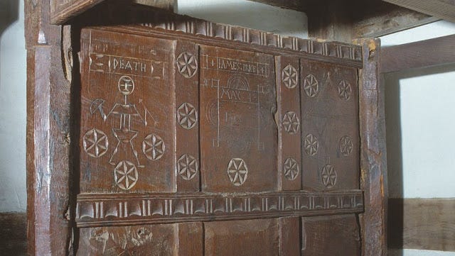 A crude figure of death can be seen holding a bow and arrow. Death is surrounded by hexfoils which are commonly known as 'Witch-marks'. These markings are believed to turn away, or ward off, evil.