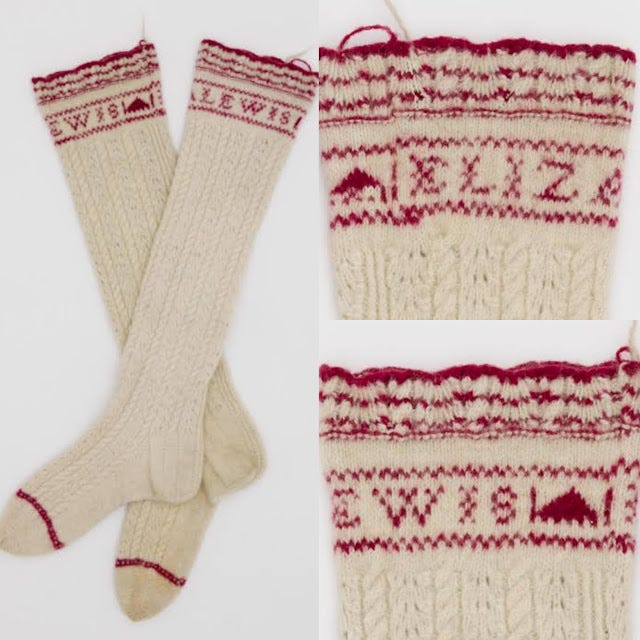 These woollen stockings were knitted by Eliza Lewis to be worn after her death. Dating from c.1850, they are made of hand-spun wool from sheep kept on her farm at Esgaironnen in Llanarth. They survived as Eliza suffered from dropsy which caused her limbs to swell and as a result of this, the stockings were too tight to be worn.