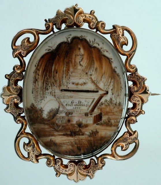 Mourning jewellery was (and still is) worn to remind the living of their deceased relatives. As well as this, they reminded the wearer of their inevitable demise. Mourning jewellery came in various forms including brooches, necklaces, and bracelets.